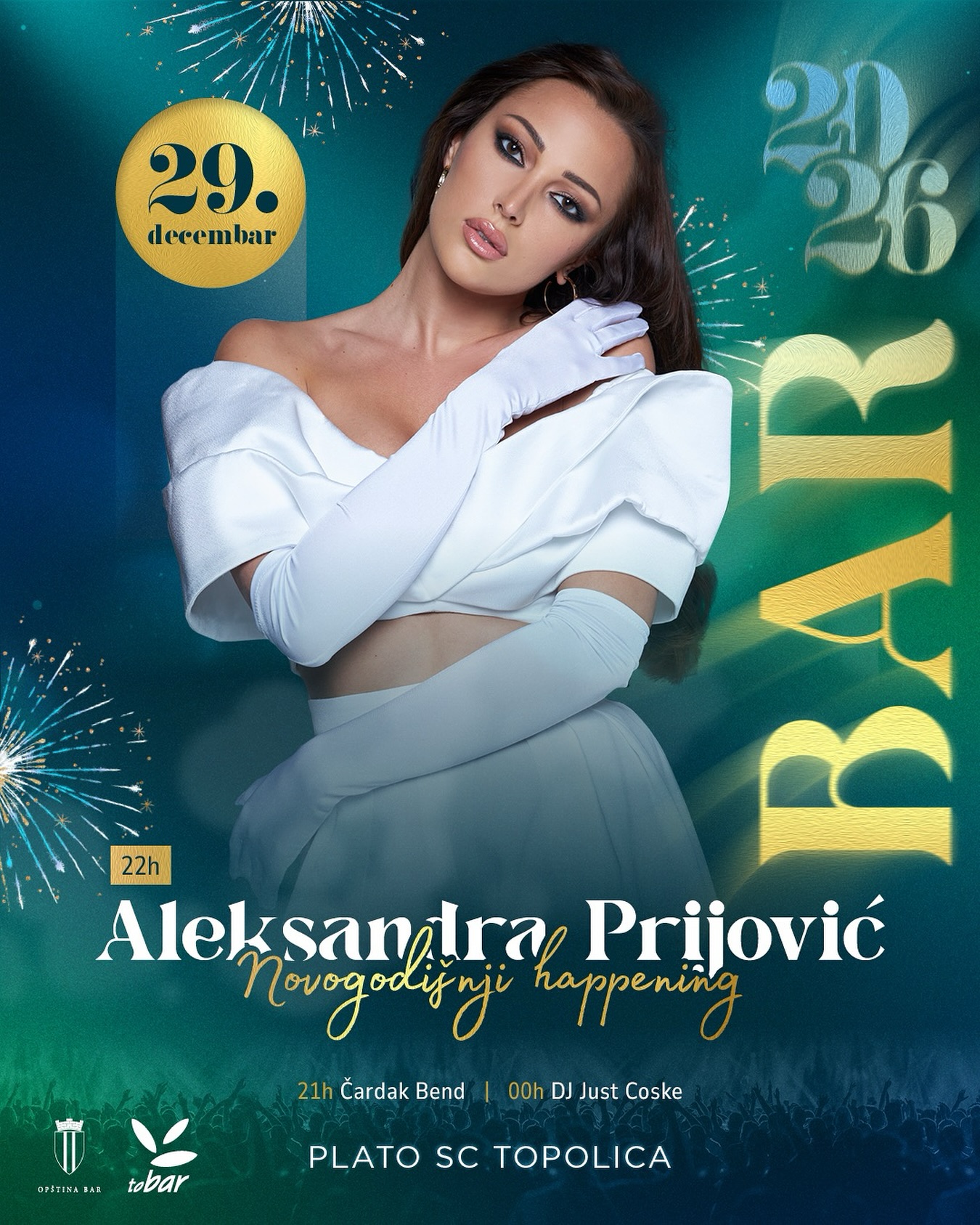 🎆 New Year's Happening 2026 starts with one of the biggest stars in the region, Aleksandra Prijović. 🎄 A real spectacle awaits us on December 29, 2025! The atmosphere before the concert will be warmed up by the local "Čardak band", followed by an after party with DJ Just Coske. 🎁 The festive atmosphere will be complemented by gastro houses, which will be set up in front of the hall. 🎉 Five days of unforgettable programs, two attractive locations and a top atmosphere are a guarantee that the New Year's holidays in Bar will be memorable! ❤️ Welcome! #bartravel #newyearhappening2026 #themostbeautifulnewyearnightinBar #montenegro #bar #ontwomagicalshores #newyear #aleksandraprijovic #crnagora
