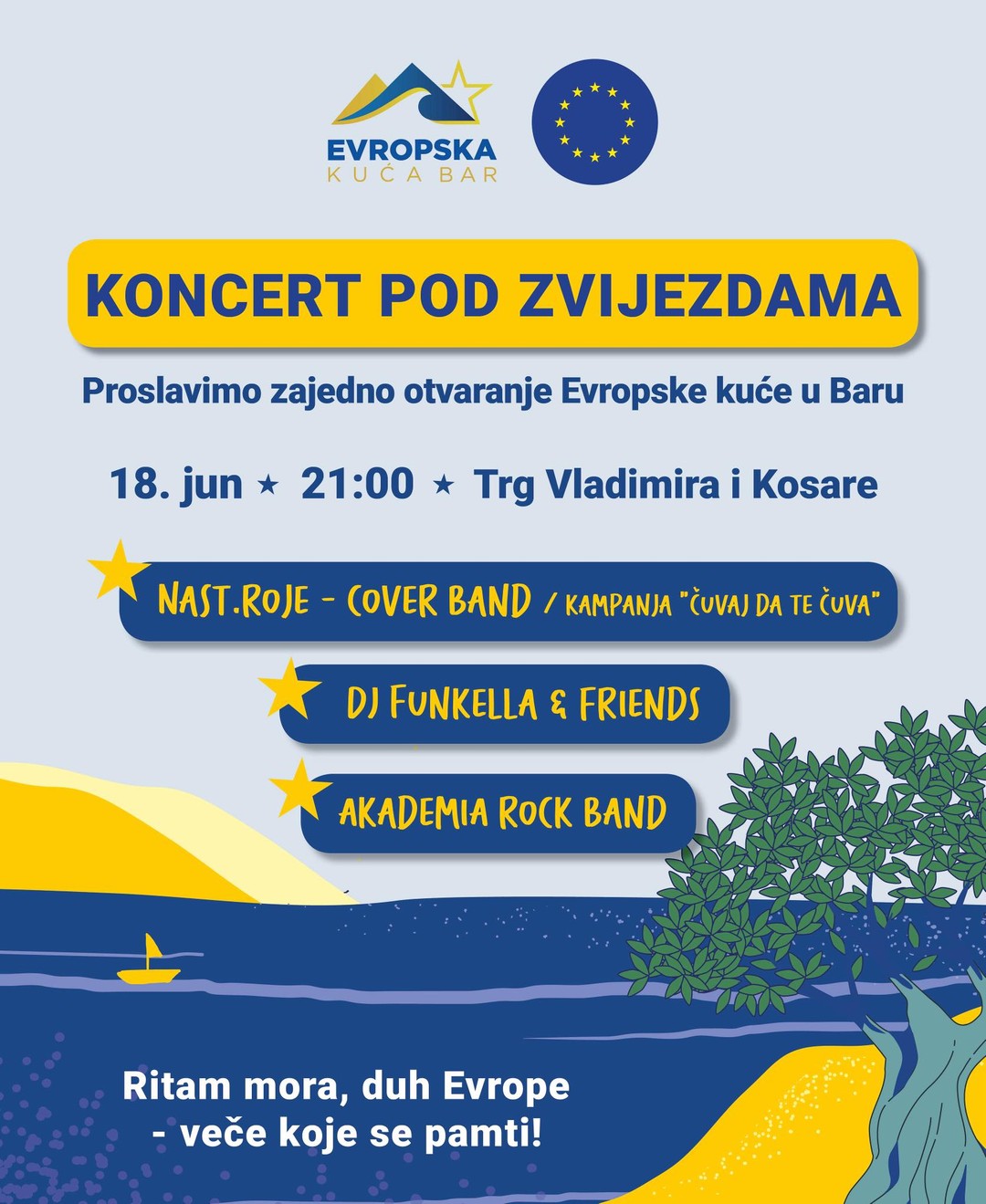 🎶✨ CONCERT UNDER THE STARS ✨🎶 📍 Vladimir and Kosare Square, Bar 📅 June 18 🕘 9:00 PM We are celebrating the opening of the European House in Bar with an evening of music, togetherness and good energy! 🌊🇪🇺 🎸 Nast.roje - cover band (as part of the “Keep it safe” campaign) 🎧 DJ Funkella & friends 🤘 AkademiA - rock band 💫 The rhythm of the sea, the spirit of Europe - a night to remember! 📲 Save the date, tag the team and let's dance under the stars! #EUzaCG #EvropskakucaBar #Bar