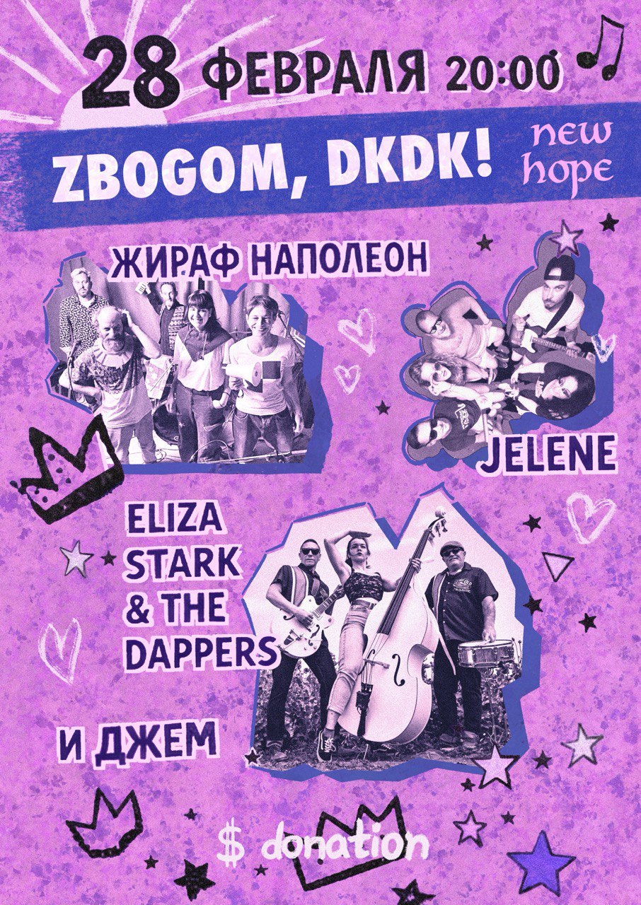 February 28th, Saturday, 8:00 PM, the last day of the DK DK closure. A day of new hope. Headliners who need no introduction will perform for you: - Napoleon the Giraffe, the wild hooligans from Herceg Novi - Jelene, a Serbian-Russian lyrical rap group - Eliza Stark & the Dappers -- boogie-woogie, surf rock, and that same girl on vocals and double bass. - After the concerts, there will be a final jam session, if anyone's up for it. All concerts in the series require a donation. Donate generously; we'll give the money to the musicians as a souvenir. There will be no bar, so bring your own alcohol and that of your neighbor. Location (https://maps.app.goo.gl/NPQyUQDWncXMTZ1s7) DK DK It's best to park further away. Gathering starts at 8 PM, music starts at 8:30 PM, and we'll slowly disperse around 1 AM.