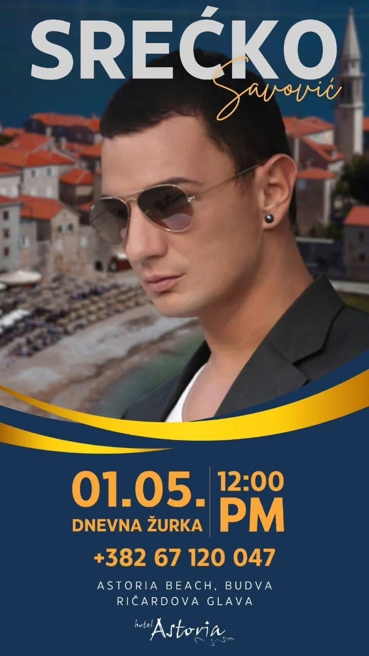 Daily party that sets the standards. May 1st | Hotel Astoria Budva At one of the most beautiful locations on the Montenegrin coast – Ričardova glava – within Hotel Astoria Budva, an exclusive day party awaits you with the energy brought by Srećko Šavović with recognizable music hits. Sun, sea, music, and an atmosphere not to be missed.
