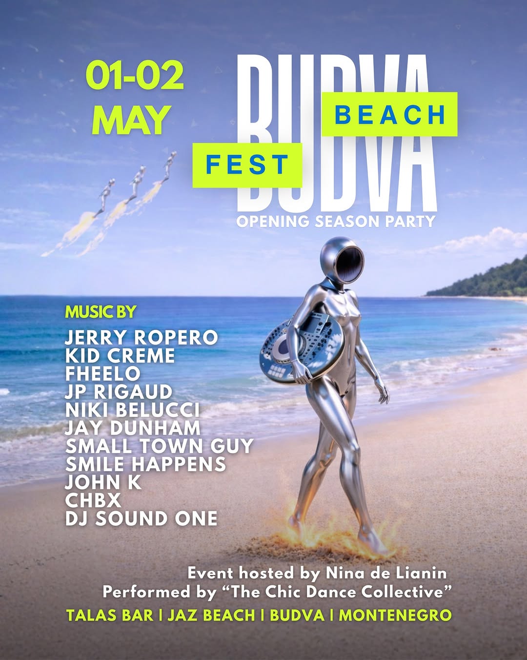 BUDVA BEACH FEST IS HERE 🌊 May 01–02 | Jaz Beach 🌴 2 days of music and pure energy An international lineup of house music legends is taking over the coast! Hosted by Nina de Lianin Performance by The Chic Dance Collective 💃 📍 Talas Bar, Jaz Beach 🎟 Tickets available now at: budvabeachfest.com Tag your crew. See you in Budva.