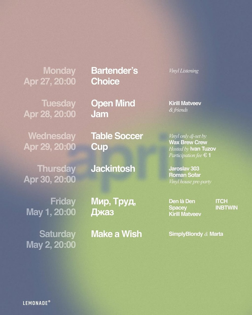 WEEKLY SCHEDULE Weekdays → music, jams & games Monday, April 27 — 20:00 Bartender’s Choice [Vinyl Listening]
