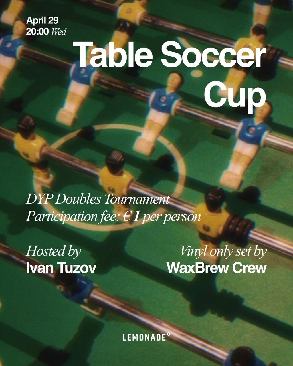 WEEKLY SCHEDULE Weekdays → music, jams & games Wednesday, April 29 — 20:00 Table Soccer Cup music by Wax Brew Crew hosted by Ivan Tuzov [DJ: Electronic. Participation fee: €1]
