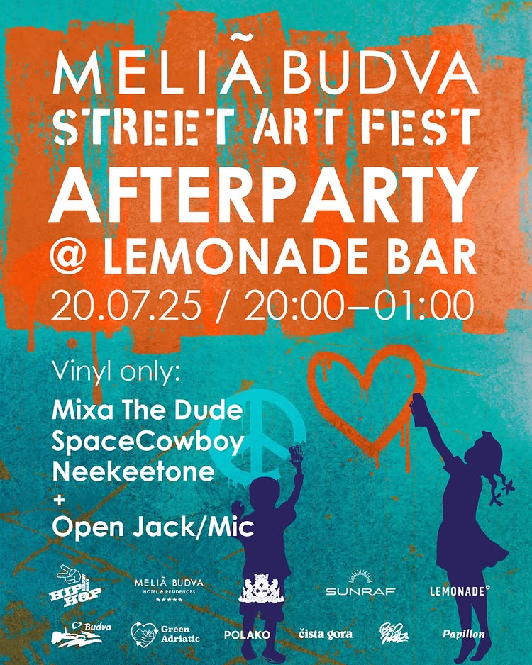 Meliã Budva Street Art Fest Afterparty at Lemonade° July 20, (sun), 20:00 The afterparty of the largest street art festival will take place on Sunday at Lemonade° Bar. Right after the exhibition ends, d’n’b producer Neekeetone, music erudite Spacecowboy and festival curator, a visionary figure in European hip-hop and street culture – Mixa The Dude will play all evening. An extra bonus will be an open mic, which will fit perfectly into a Sunday evening. Free admission, starts at 20:00 Lemonade° Bar Bečići