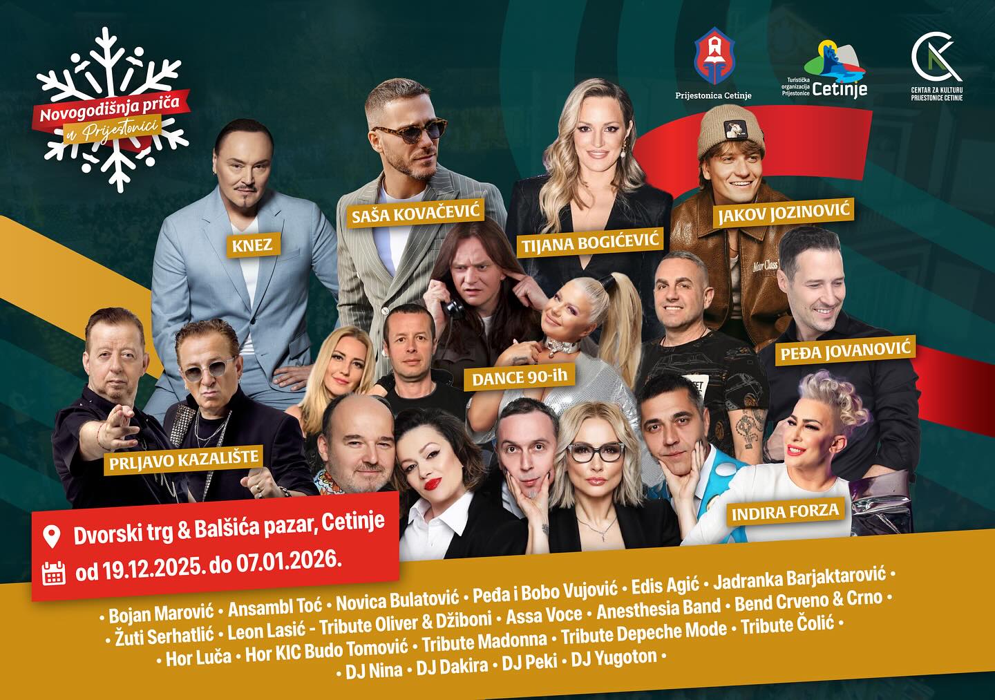 ✨ New Year's Story in the Royal Capital 2025/26 📍 Dvorski trg & Balšića pazar 📅 December 19, 2025 - January 7, 2026 🗓️ During the three-week program, numerous local and regional performers, tribute bands and DJs will perform, including: Prljavo kazalište, Saša Kovačević, Tijana Bogićević, Jakov Jozinović, Peđa Jovanović, Indira Forza, Knez and many others. ⛸️ The event also includes a rich holiday bazaar, a free ice rink, as well as a full-day program for children at Balšića pazar. 📣 We invite visitors from all over Montenegro and the region to enjoy the festive atmosphere and content of "New Year's Stories in the Royal Capital".