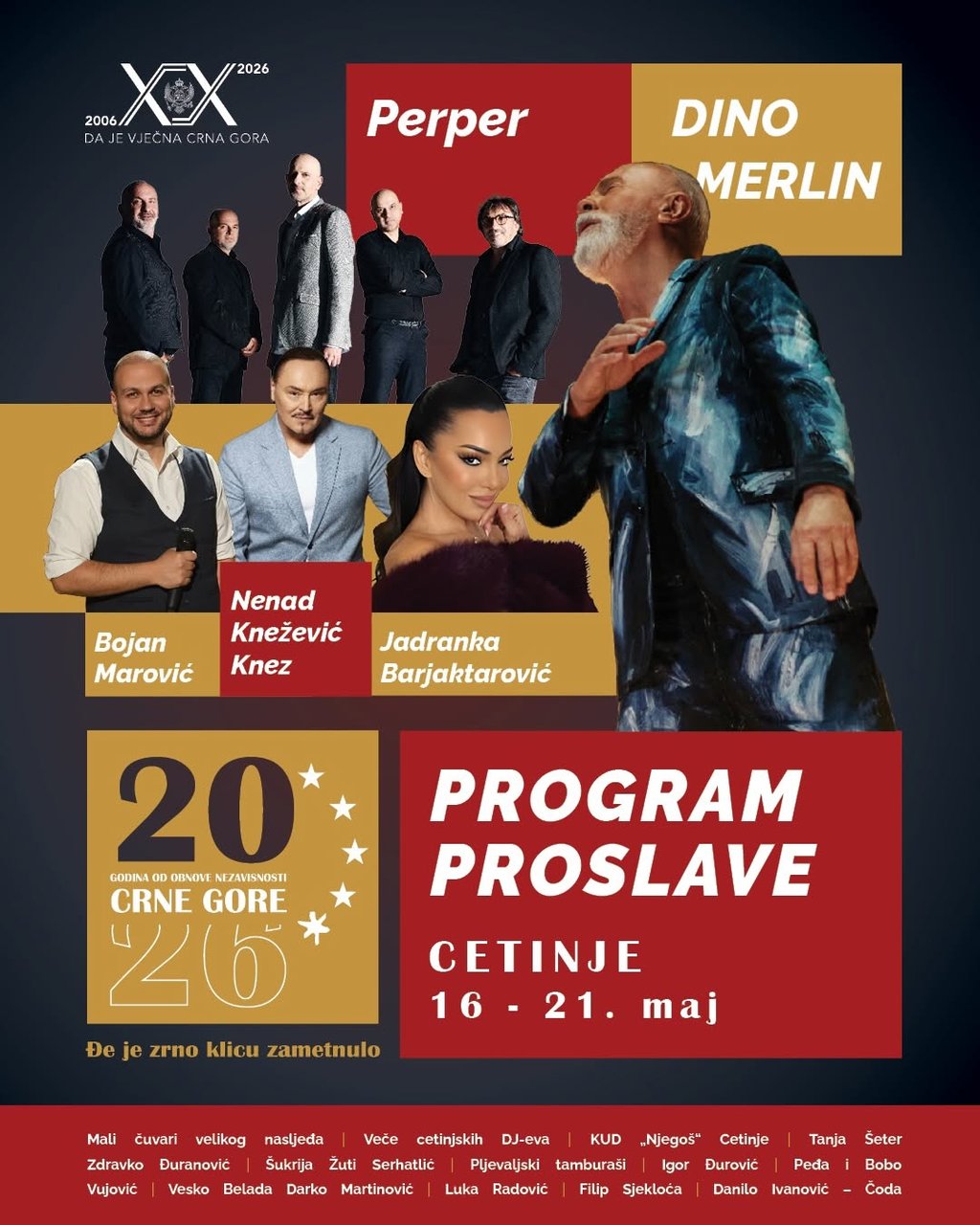 Cetinje will celebrate 20 years since the restoration of Montenegro's independence from May 16 to May 21 with a rich and diverse cultural and music program. The program features performances by prominent Montenegrin artists - Bojan Marović, the group Perper, Slaven Knežević Knez, Jadranka Barjaktarović, Zdravko Đuranović, Šukrija Žuti Serhatlić, and many others. The central music event will be a concert by one of the biggest regional music stars, Dino Merlin. The concert will take place on May 21 at Dvorski trg.