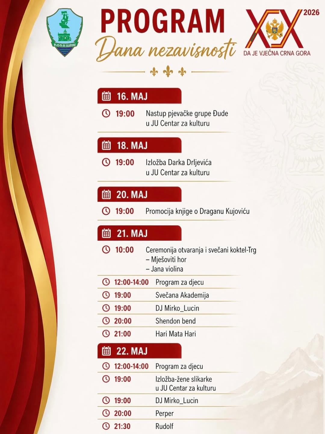 The Municipality of Kolašin invites you to celebrate the Independence Day of Montenegro together Through a rich cultural and artistic program, music, exhibitions and activities for the youngest, we will celebrate the values of freedom, unity and tradition that bind us together. Come and share the joy of the holiday together and enjoy days filled with art, music and good energy.