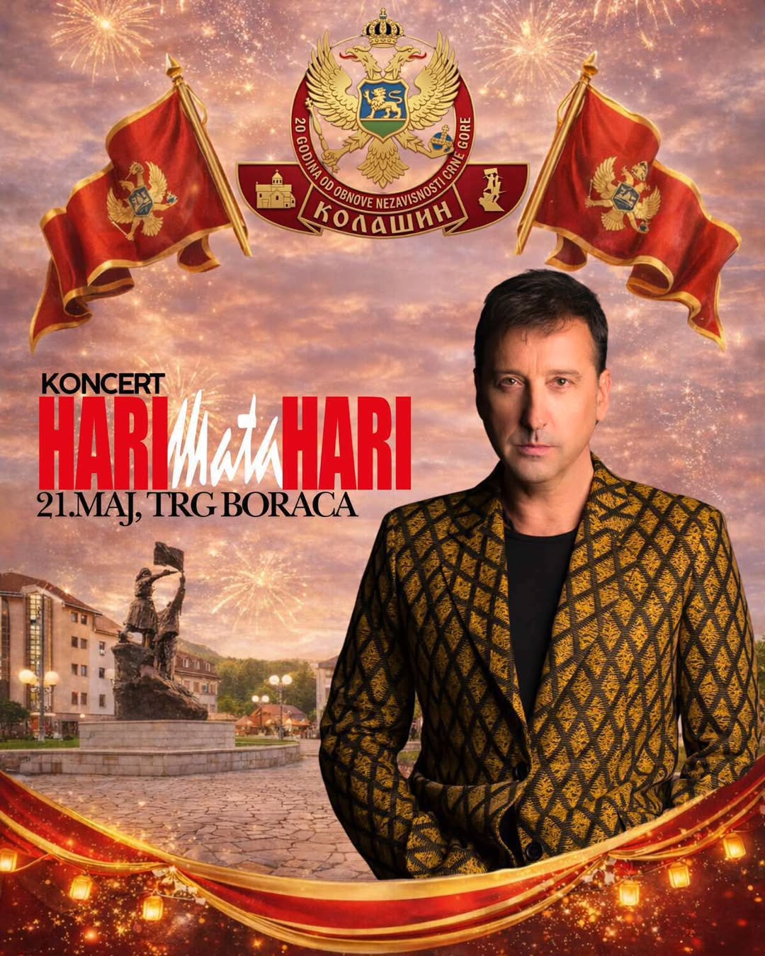 Independence Day Gala Concert in Kolašin The Municipality of Kolašin is organizing a concert by Hari Mata Hari to celebrate the Independence Day of Montenegro 🇲🇪, which will be held on May 21st at the Soldiers' Square, starting at 9 pm. The concert is part of the official program of celebrating the holiday, and a large number of citizens and visitors are expected to attend. The Municipality of Kolašin invites the public to contribute to the celebration of this important date by attending.