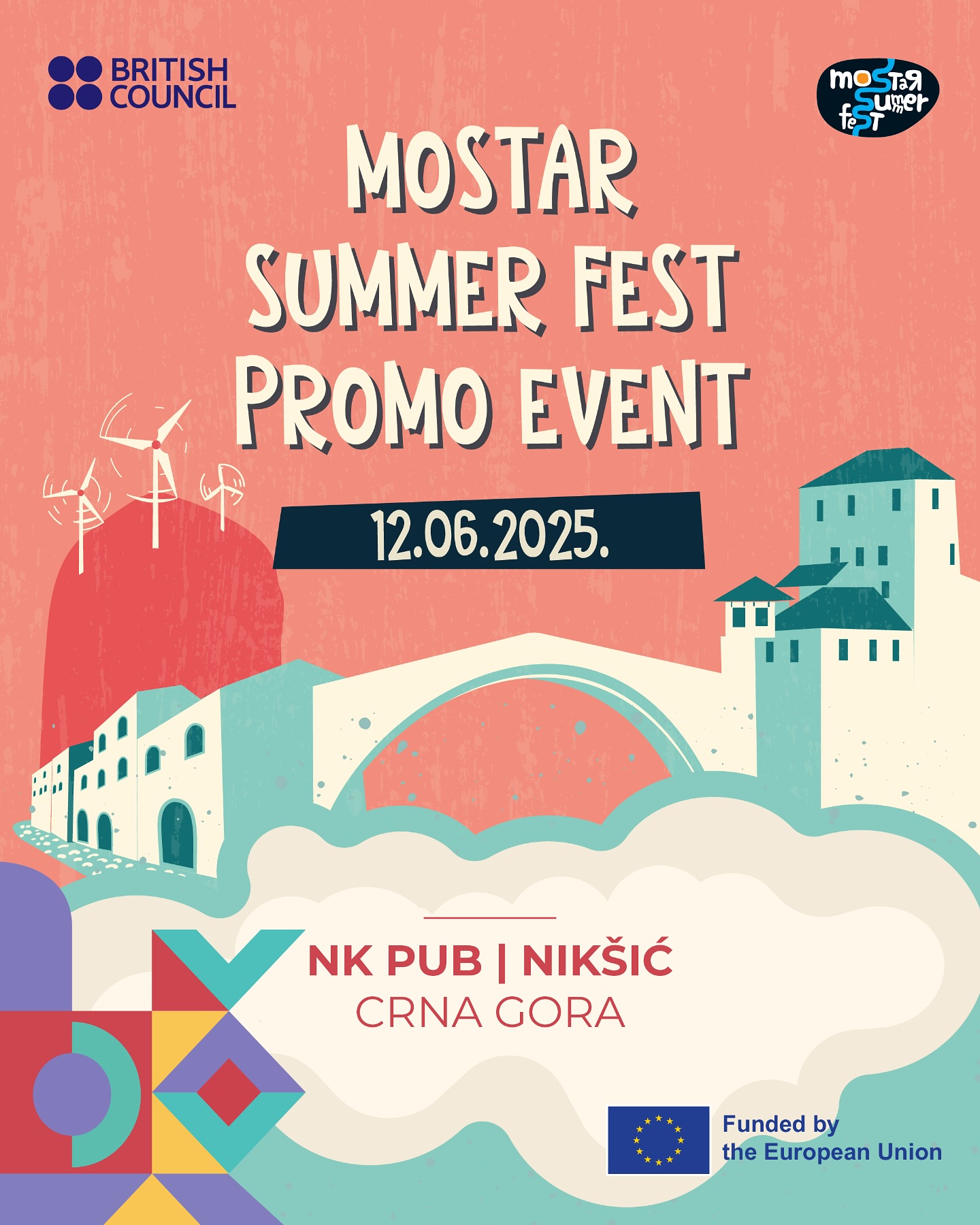 🎸 Mostar Summer Fest is coming to Nikšić! 🎶 Festival goers from Nikšić and the surrounding area, on Wednesday, 12.6, in the evening, come to NK pub for a promo event and socializing with a performance by the band @kud_kuvajt from Mostar! 🔥 A great opportunity to find out everything about this year's edition of Mostar Summer Fest, a three-day open-air adventure in Mostar that will take place on the first weekend of July. Admission to the concert is free, and fun is guaranteed! See you in Nikšić. 🍻 The event is organized as part of the Balkan Fest Connect: Expanding Cultural Frontiers Through Collaboration project, supported by the British Council. Balkan Fest Connect is implemented as part of the Culture and Creativity for the Western Balkans (CC4WBs) project funded by the European Union, and its goal is to encourage dialogue in the Western Balkans through the promotion of the cultural and creative sector in order to increase socio-economic impact. @cc4wbs @eubih