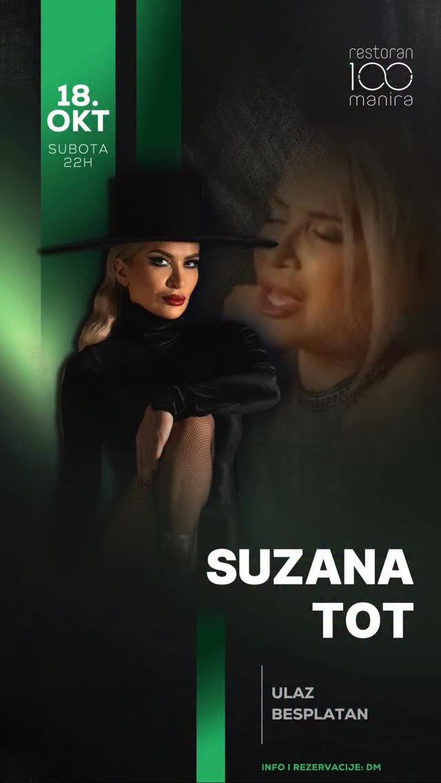 ✨ SATURDAY IN THE NAME OF MUSIC & GLAMOUR ✨ Join us for an unforgettable evening with a performance by the unique Suzana Tot! 🎤 Top-notch music, emotions and an atmosphere that you will remember for a long time await you. 💫 🗓️ October 18th (Saturday) ⏰ 10:00 PM 📍 Restaurant 100 Manira 🎟 Free admission 📩 Info & reservations: DM