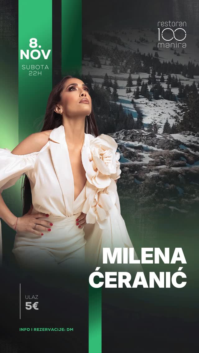 🎤 MILENA ĆERANIC LIVE 🗓️ Saturday, November 8th ⏰ Starts at 10pm 📍 Restaurant 100 Manira 🎟️ Entrance €5 Don't miss an evening of great fun and energy with Milena Ćeranić's unforgettable hits! 🔥 📩 Info and reservations: DM #100Manira #MilenaĆeranić #LiveMusic #Podgorica
