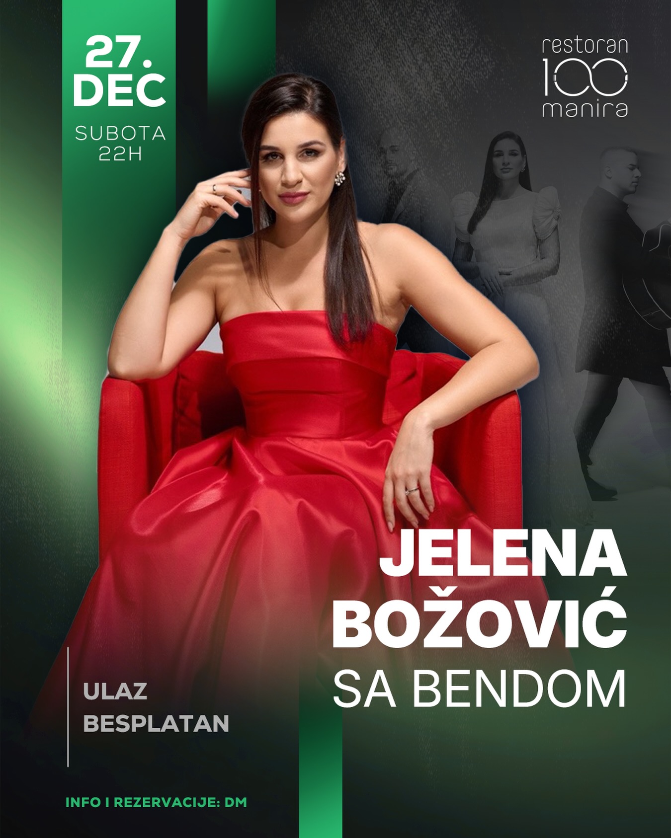 ✨ An evening of elegance and top music ✨ 📅 Saturday | December 27 🕙 10pm 📍 Restaurant 100 Manira 🎤 Jelena Božović with the band Enjoy the emotional repertoire and special atmosphere for the perfect end of December. 🎟️ Free admission 📩 Info and reservations: DM See you 💫