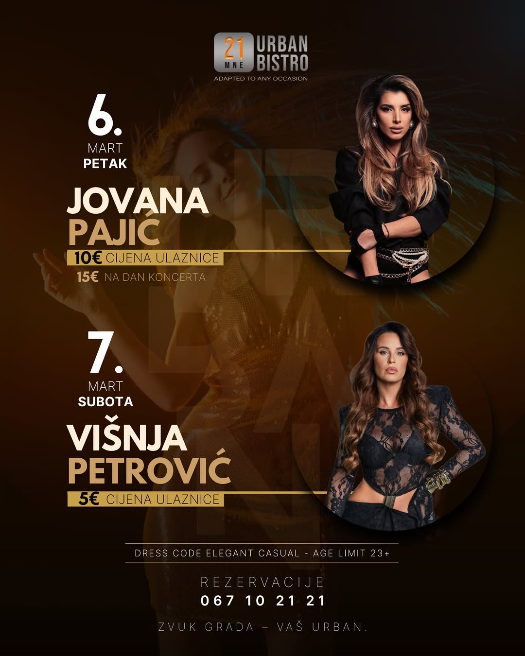 Sound of the city - Your Urban! 👉 On Friday, March 6th, guests Jovana Pajić! 🎟️ €10 ticket price, on the day of the concert €15. 👉 On Saturday, March 7th, Višnja Petrović performs! 🎟️ €5 ticket price! 📌 Dress code: Elegant Casual 🔞 Entrance 23+ 📲 Reservations: 067 10 21 21 Urban – a place where the city breathes music. ✨