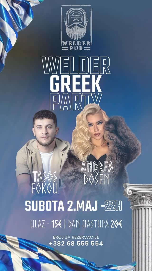 🇬🇷🔥 Balkan Greek Party arrives at Welder Pub! 🔥🇬🇷 Get ready for a night of top atmosphere, good energy and the biggest hits with a mix of Balkan and Greek temperament with special guests: 🎤 Andrea Došen 🎤 Tasos Fokou 🗓️ Saturday, May 2nd 🕙 Starts at 10 PM 🎟 Presale: 15€ 🎟 On the day of the performance: 20€ 📞 Reservations: +382 67 555 554 A night full of music, dancing and unforgettable atmosphere awaits you at Welder Pub! 🇬🇷🔥