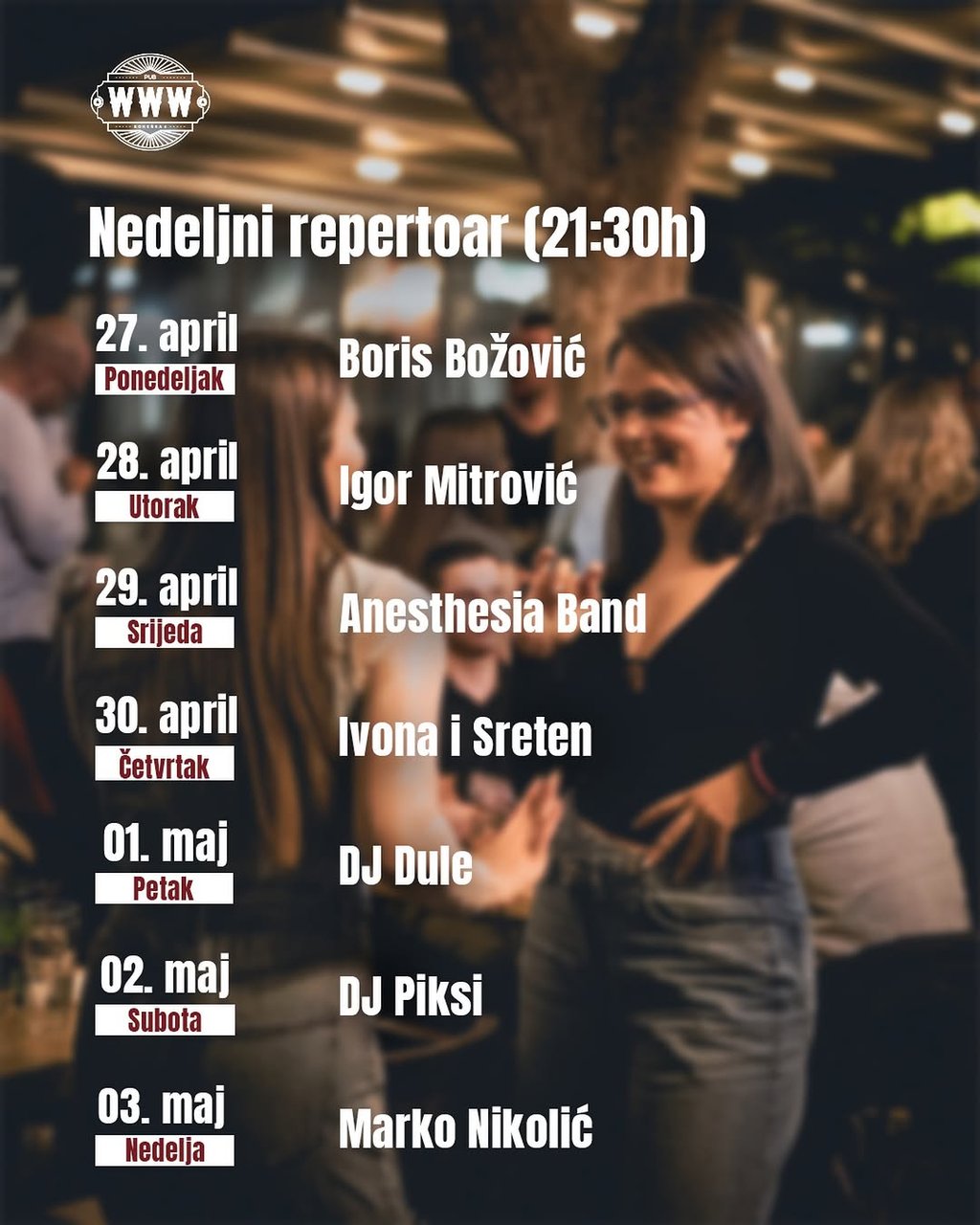 Weekly repertoire at Pub WWW. Artist: DJ Dule Date: May 1st