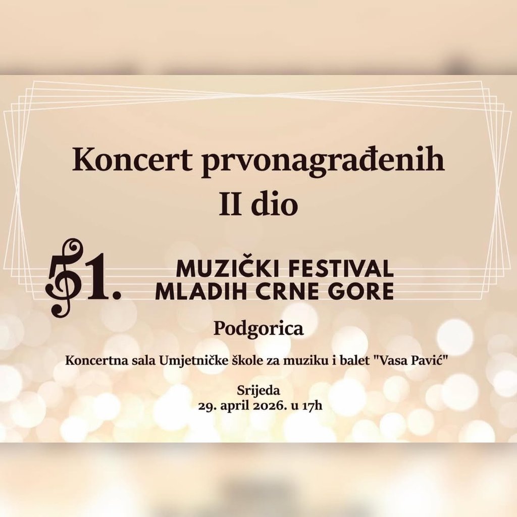 Concert of award-winning students as part of the 51st Music Festival of Young People of Montenegro. The audience will have the opportunity to enjoy another concert by the most successful young artists, the winners of the first prizes from this year's festival.