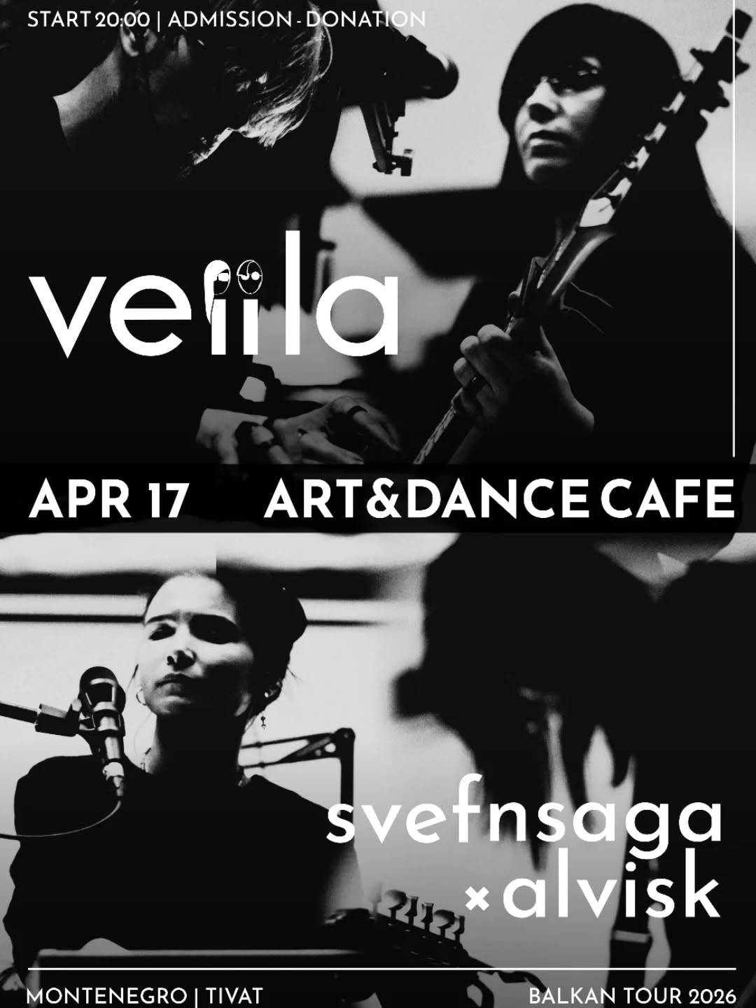 MORE MONTENEGRO PLEASE! We loved it so much, we just couldn't leave without one more spontaneous concert! April 17, 8pm - Art & Dance Cafe @artanddancecafetivat Magnolia trg., Tivat Admission: donation The last concert of the two-week Balkan tour of two music duets from Armenia - veiila and svefnsaga x alvisk - who share a common goal of breaking the boundaries of art tradition by means of their sophisticated futuristic music. @veiilamusic minimalist electronic sound, retroesque bluesy guitars, velvet keyboards and dark introspective lyrics. @svefnsaga @alvisk.music intimate songs with folk sensibility, traditional instruments and experimental electronica