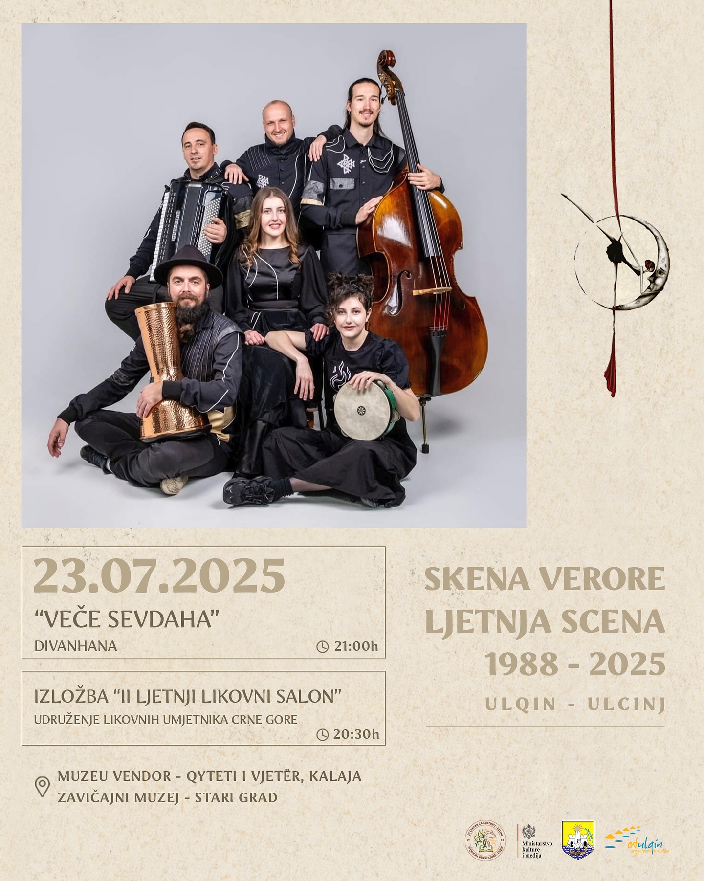 📅 On Wednesday, July 23, 2025, as part of the "Summer Scene 2025" program, two cultural events combining fine art and traditional music will be held in the premises of the Heritage Museum at the Ulcinj Fortress: 🖼 At 8:30 PM - the exhibition "II Summer Art Salon" of the Association of Fine Artists of Montenegro opens. 🎶 At 9:00 PM - the concert of the famous group Divanhana begins, bringing a contemporary interpretation of traditional sevdalinka.