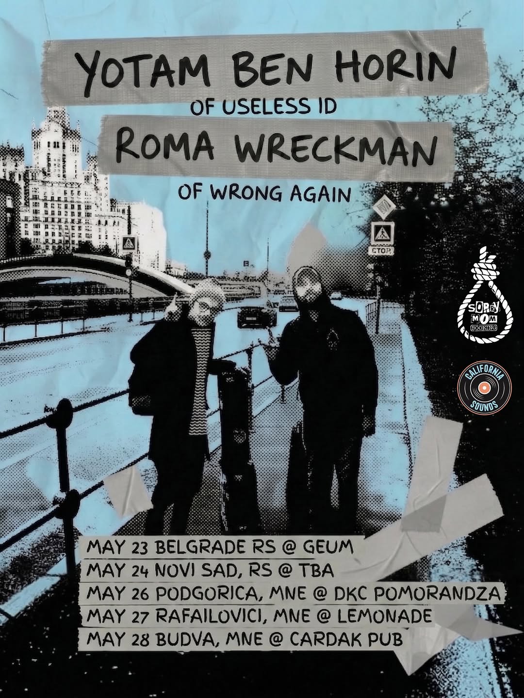 PRAVI PUTNIČARI, OKUPITE SE! Yotam Ben Horin (Useless ID) i Roma Wreckman (Wrong Again) ponovo kreću zajedno na turneju prvi put nakon 10 godina. Vrijeme leti, zar ne? Ovo će ujedno biti i prvi Yotamovi koncerti u Crnoj Gori i Srbiji 🇲🇪🇷🇸 Vežite pojaseve! 23. maj – Beograd, RS @ Geum* @geum.bistro 24. maj – Novi Sad, RS @ TBA* 26. maj – Podgorica, MNE @ DKC Pomorandža+ 27. maj – Rafailovići, MNE @ Lemonade Bar+ @lemonadebar.me 28. maj – Budva, MNE @ Čardak Craft Pub+ @cardak_budva * sa Leom i Sashom @fuckingswearbox + sa Sashom Suicide @sasha__suicide Dođite, pozdravite se, povedite prijatelje i hajde da se zabavimo. xoxo